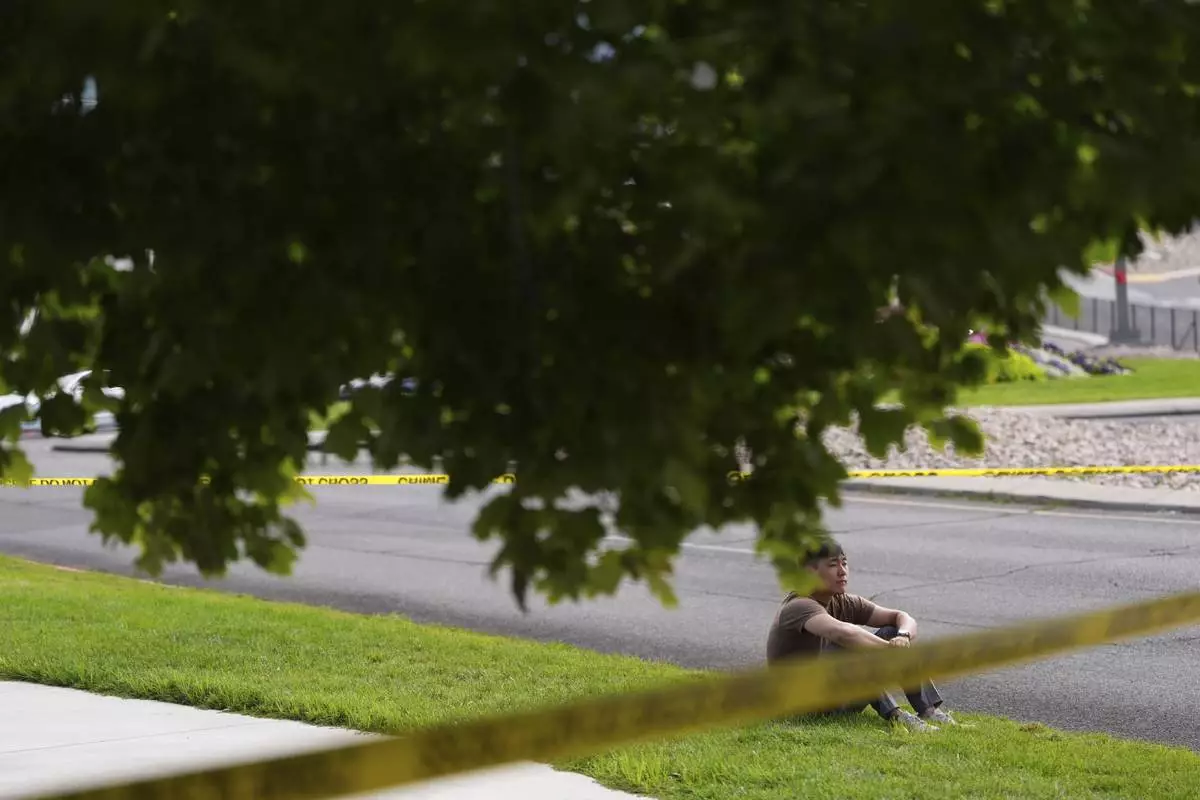 A person sits near crime scene tape near a memorial after Turning Point USA CEO and co-founder Charlie Kirk was shot and killed at Utah Valley University, Saturday, Sept. 13, 2025, in Orem, Utah. (AP Photo/Lindsey Wasson)