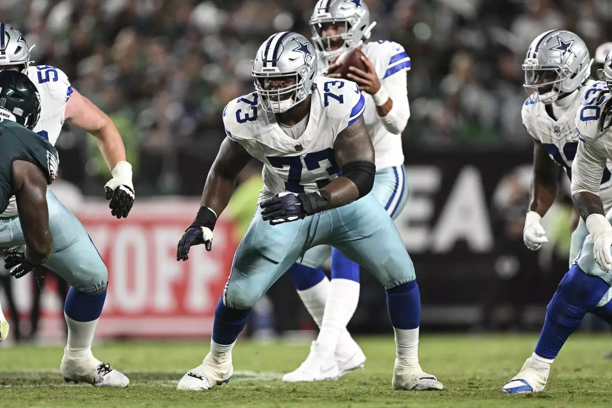 FILE - Dallas Cowboys guard Tyler Smith (73) prepares to block during the second half of an NFL football game against the Philadelphia Eagles, Thursday, Sept. 4, 2025, in Philadelphia. (AP Photo/Terrance Williams, File)
