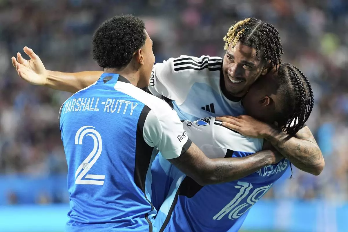 Charlotte FC forward Idan Toklomati, center, celebrates his goal with defender Jahkeele Marshall-Rutty (2) and forward Kerwin Vargas (18) during the first half of an MLS soccer match against Inter Miami, Saturday, Sept. 13, 2025, in Charlotte, N.C. (AP Photo/Erik Verduzco)