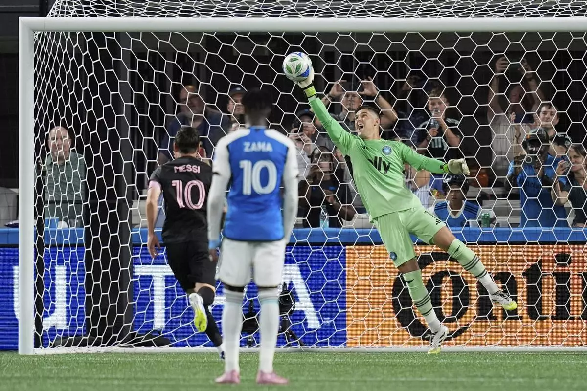 Charlotte FC goalkeeper Kristijan Kahlina (1) stops a penalty shot from Inter Miami forward Lionel Messi, left, during the first half of an MLS soccer match, Saturday, Sept. 13, 2025, in Charlotte, N.C. (AP Photo/Erik Verduzco)