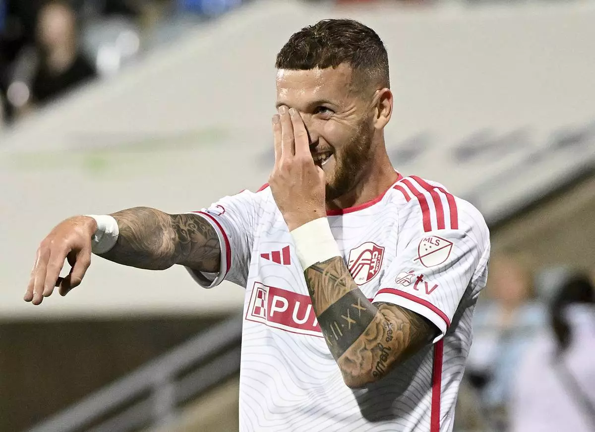 St. Louis City's Marcel Hartel (17) reacts after scoring against CF Montreal during the second half of a MLS soccer game in Montreal on Saturday, Sept. 13, 2025. (Graham Hughes/The Canadian Press via AP)