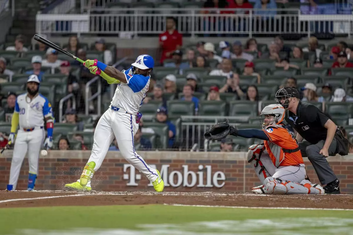 Atlanta Braves' Michael Harris II (23) attempts a hit during the third inning of a baseball game against the Houston Astros, Saturday, Sept. 13, 2025, in Atlanta. (AP Photo/Erik Rank)
