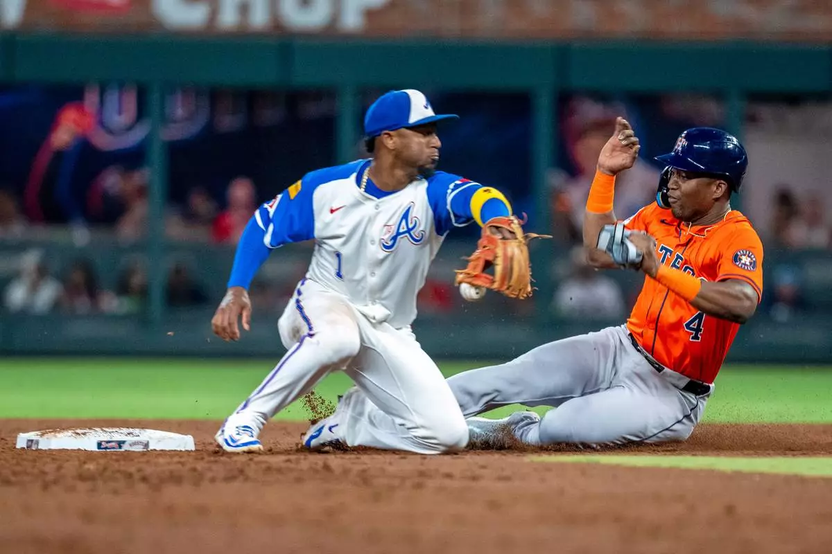 Houston Astros' Jesús Sánchez (4) steals second base from Atlanta Braves second baseman Ozzie Albies (1) during the third inning of a baseball game Saturday, Sept. 13, 2025, in Atlanta. (AP Photo/Erik Rank)