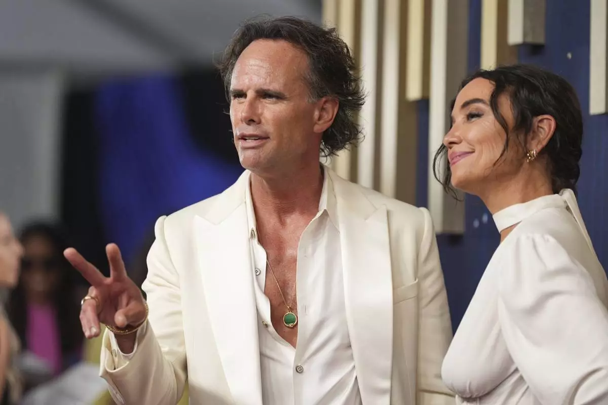 Walton Goggins, left, and Nadia Conners arrive at the 77th Primetime Emmy Awards on Sunday, Sept. 14, 2025, at the Peacock Theater in Los Angeles. (AP Photo/Jae C. Hong)