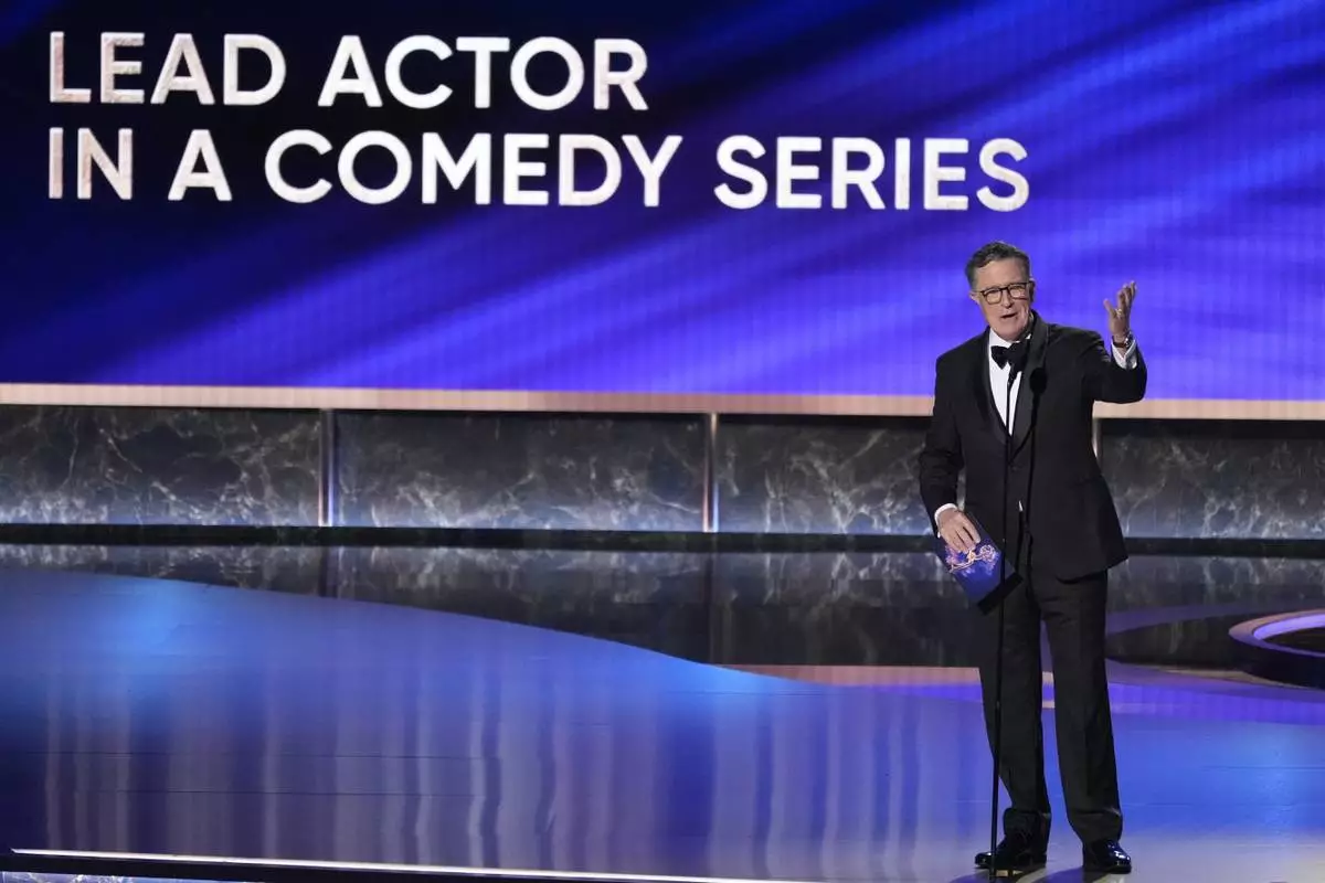 Stephen Colbert presents the award for outstanding lead actor in a comedy series during the 77th Primetime Emmy Awards on Sunday, Sept. 14, 2025, at the Peacock Theater in Los Angeles. (AP Photo/Chris Pizzello)