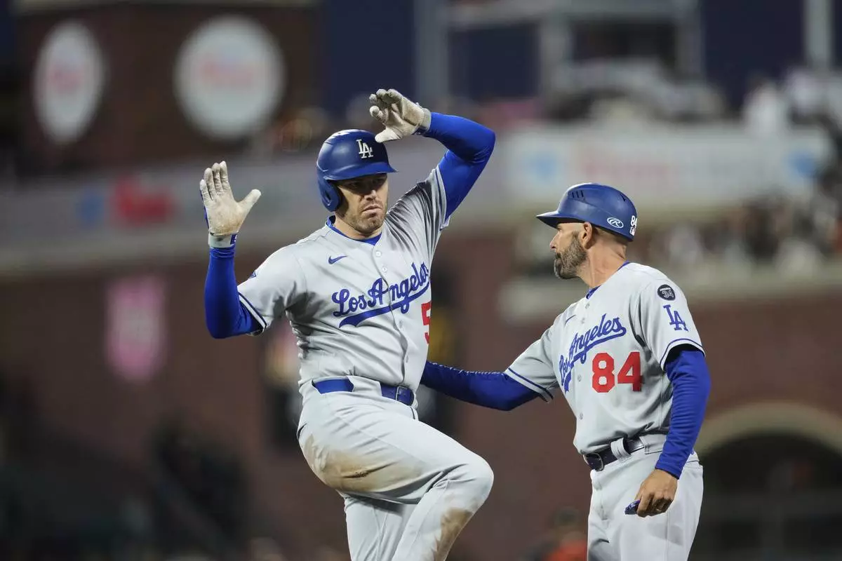 Los Angeles Dodgers' Freddie Freeman, left, celebrates with first base coach Chris Woodward after hitting a single during the fifth inning of a baseball game against the San Francisco Giants, Saturday, Sept. 13, 2025, in San Francisco. (AP Photo/Godofredo A. Vásquez)