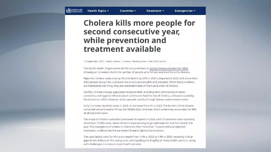 The WHO's global cholera statistics for 2024 showed the scope of cholera outbreaks continued to expand last year, with nearly 560,000 infections reported in 60 countries and regions and more than 6,000 people dying from the disease. The number of countries and regions reporting cases increased from 45 in 2023.