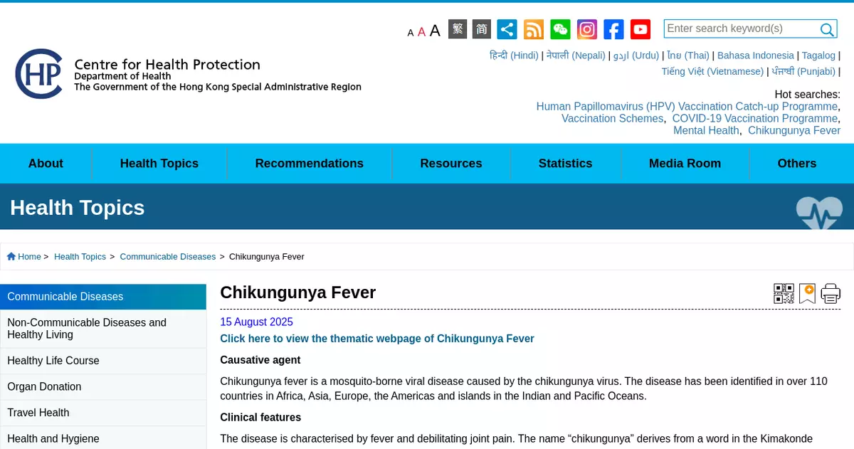 From January to July this year, more than 240 000 cases were recorded in 16 countries/regions worldwide, including about 90 deaths. In Asia, India and Indonesia recorded more than 32 000 and 17 000 cases respectively in 2025. Other regions that have recorded CF cases include the Mainland, Bangladesh and Sri Lanka, etc. Although the situation in Guangdong Province has been under control since late August, with only sporadic new cases reported each day, CF outbreaks continue in many countries worldwide. Members of the public should check the situation of the destinations before travelling abroad.