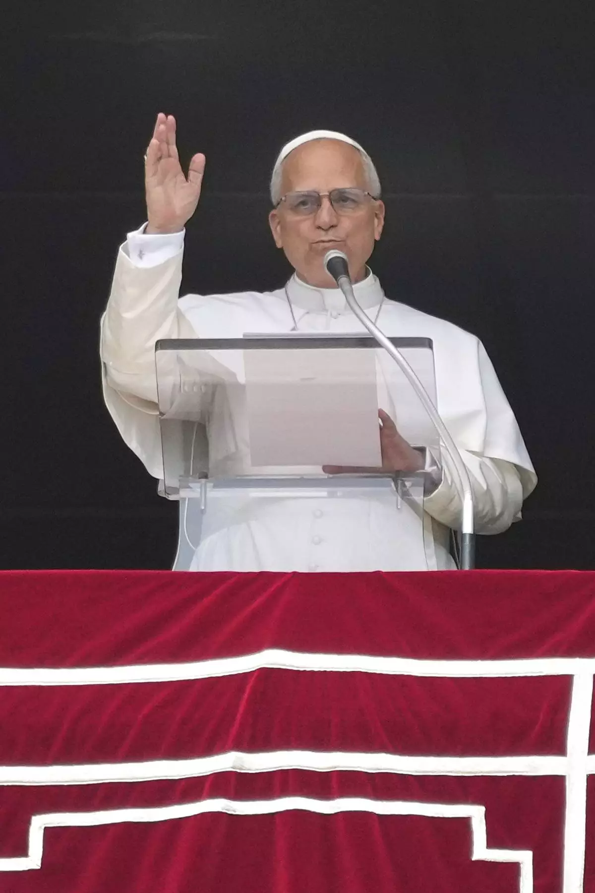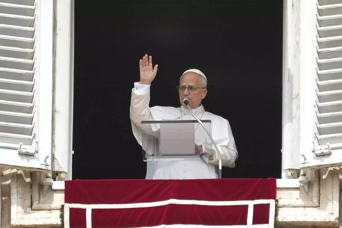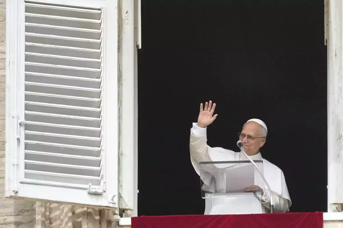 Pope Leo XIV appears at his studio's window to bless the faithful gathered in St. Peter's Square at the Vatican for the Angelus prayer, Sunday, Sept. 14, 2025. (AP Photo/Gregorio Borgia)