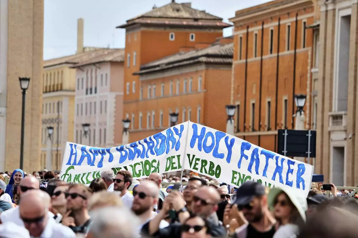 Leo saw giant “Happy birthday” banners, in English, Italian and Spanish, balloons and congratulatory signs held up by the faithful gathered in St. Peter’s Square. Groups of Peruvian believers, including dancers in traditional attire, were out in force.