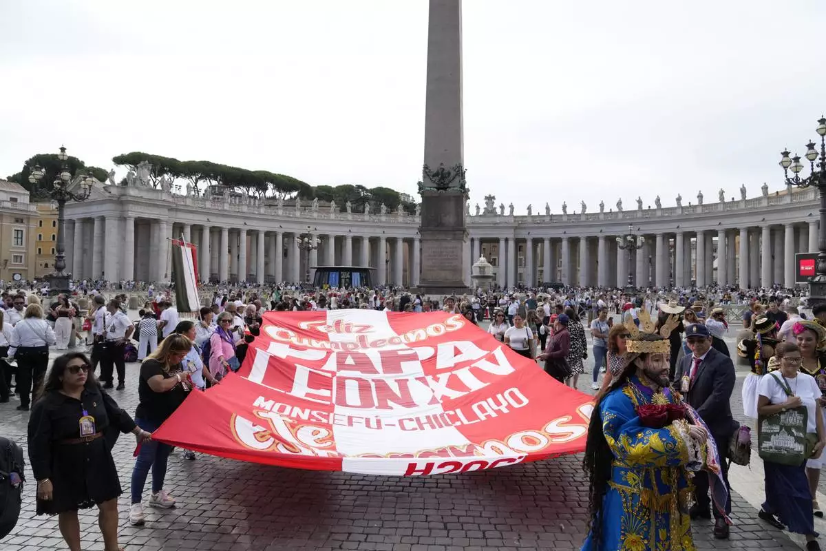 Faithful from Peru display a banner wishing happy 70th birthday to Pope Leo XIV with a statue of Jesus Nazareno Cautivo de Monsefu, as he appears at his studio's window to bless the faithful gathered in St. Peter's Square at the Vatican for the Angelus prayer, Sunday, Sept. 14, 2025. (AP Photo/Gregorio Borgia)