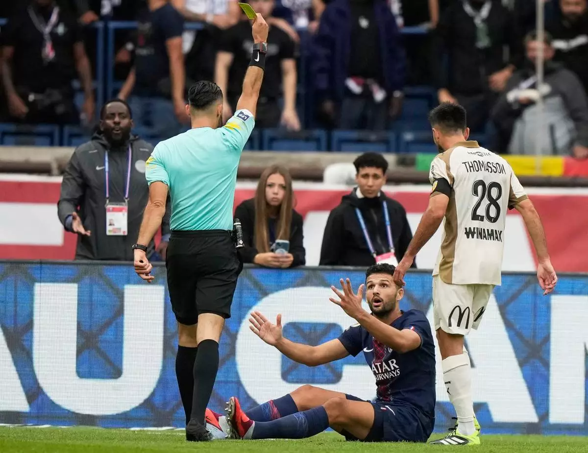 PSG's Goncalo Ramos, center, reacts as he receives a yellow card during the French League One soccer match between Paris Saint-Germain and Lens at the Parc des Princes stadium in Paris, Sunday, Sept. 14, 2025. (AP Photo/Michel Euler)