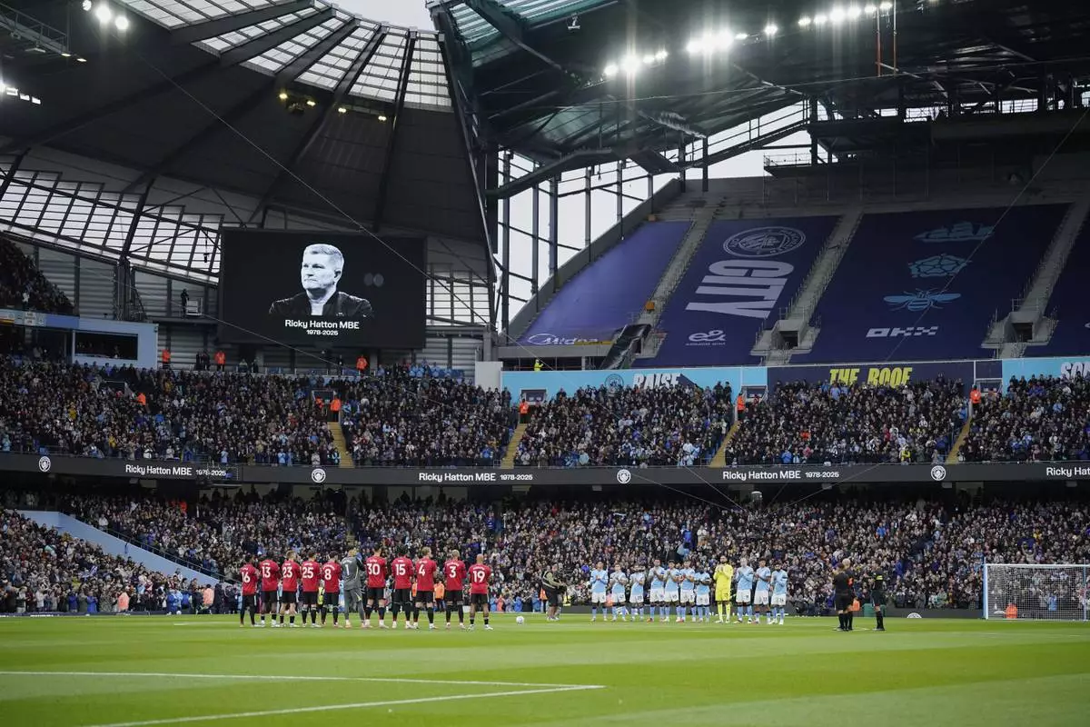 Players stand during a minute of silence for a former boxer Ricky Hatton before the Premier League soccer match between Manchester City and Manchester United in Manchester, England, Sunday, Sept. 14, 2025. (AP Photo/Dave Thompson)