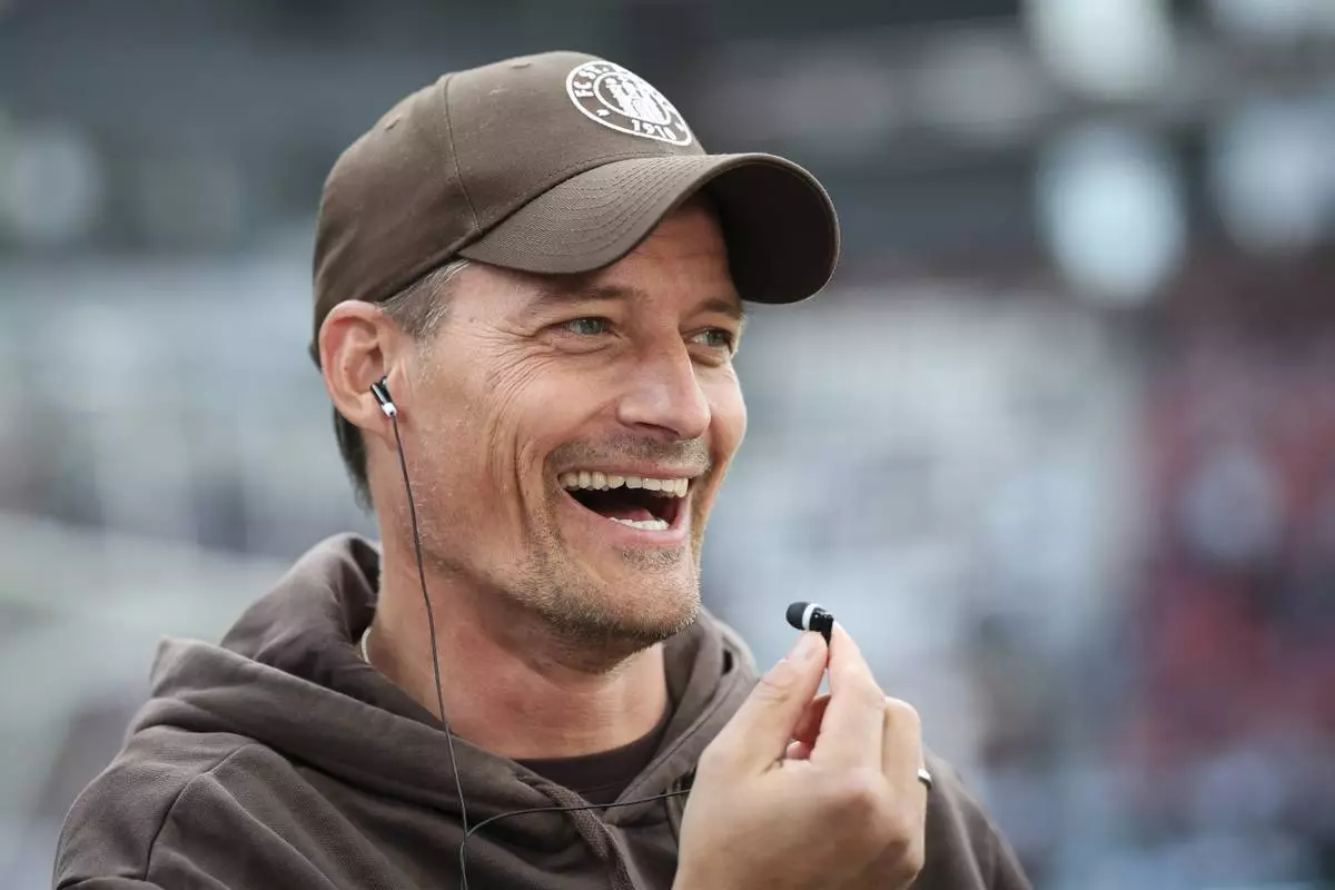 St. Pauli's head coach Alexander Blessin before the German Bundesliga soccer match between 1. FC St. Pauli and FC Augsburg in Hamburg, Germany, Sunday, Sept. 14, 2025. (Christian Charisius/dpa via AP)