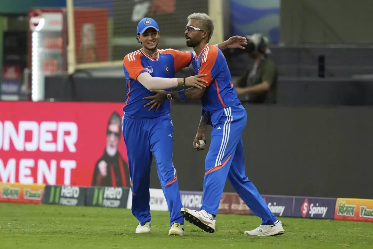 India's Hardik Pandya, right, celebrates with teammate Shubman Gill after the dismissal of Pakistan's Saim Ayub during the Asia Cup cricket match between India and Pakistan at Dubai International Cricket Stadium in Dubai, United Arab Emirates, Sunday, Sept. 14, 2025. (AP Photo/Fatima Shbair)