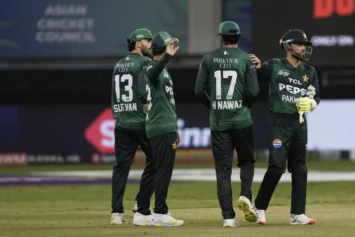 Pakistan players greet each other after their loss in the Asia Cup cricket match against India at Dubai International Cricket Stadium in Dubai, United Arab Emirates, Sunday, Sept. 14, 2025. (AP Photo/Fatima Shbair)