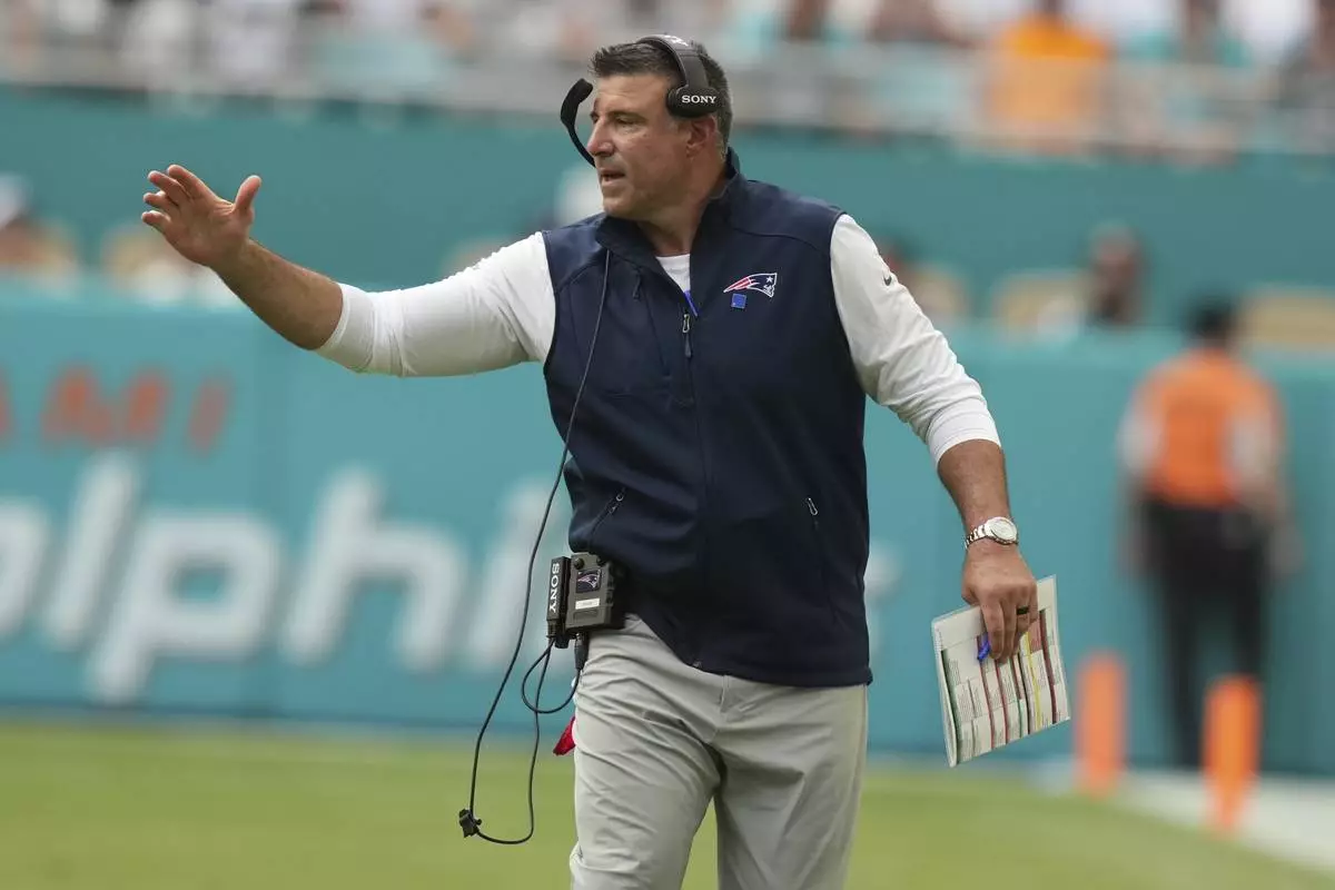 New Englan Patriots head coach Mike Vrabel reacts during the second half of an NFL football game against the Miami Dolphins Sunday, Sept. 14, 2025, in Miami Gardens, Fla. (AP Photo/Lynne Sladky)