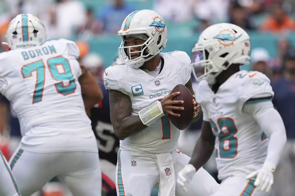 Tagovailoa completed 26 of 32 passes for 315 yards. He threw an 18-yard touchdown pass to Jaylen Waddle and a 29-yard TD pass to De'Von Achane. Tyreek Hill caught six passes for 109 yards, including a 47-yard catch in the third quarter — the star receiver's first reception of more than 30 yards since last season's opener.