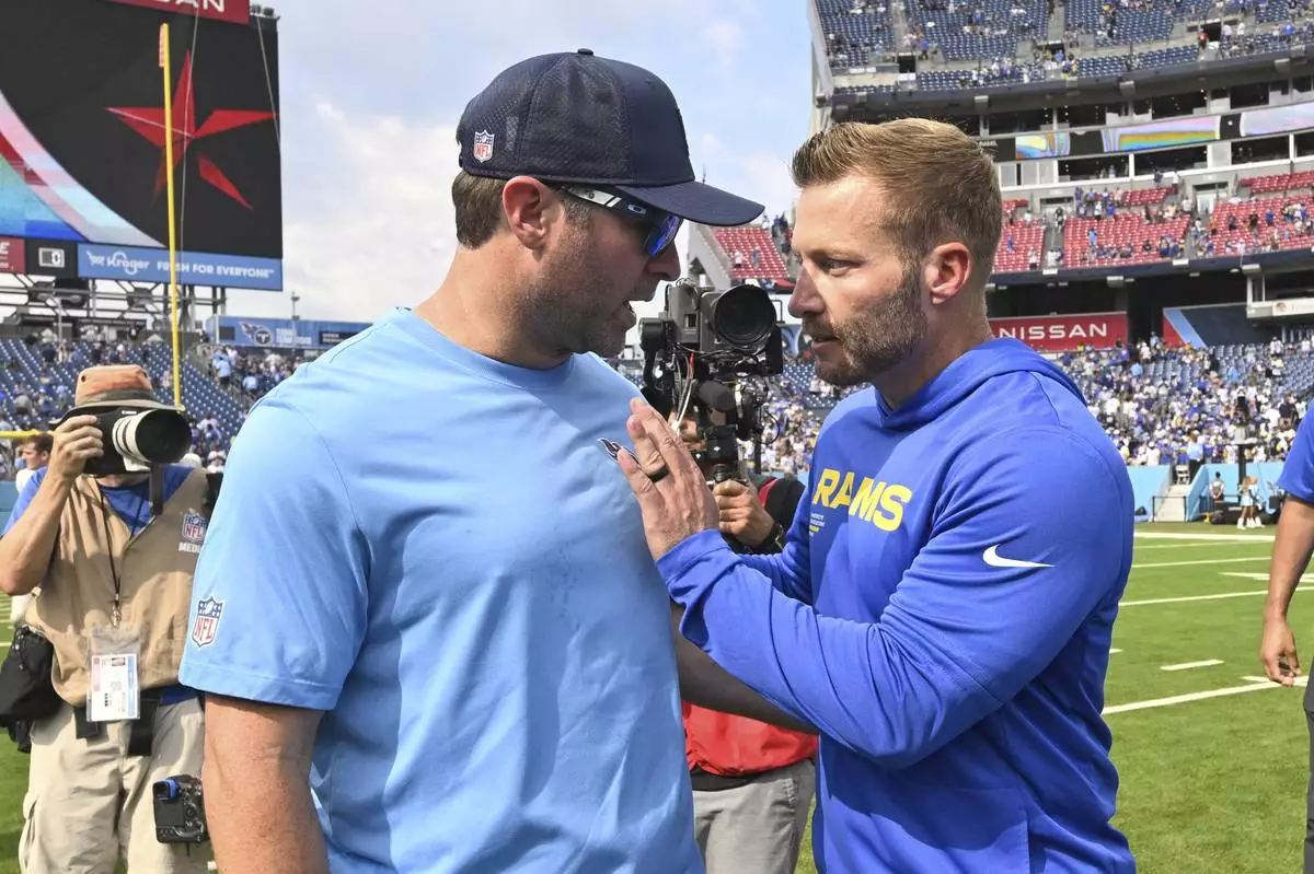 Tennessee Titans head coach Brian Callahan, left, and Los Angeles Rams head coach Sean McVay greet each other after the Rams defeated the Titans in an NFL football game Sunday, Sept. 14, 2025, in Nashville, Tenn. (AP Photo/John Amis)