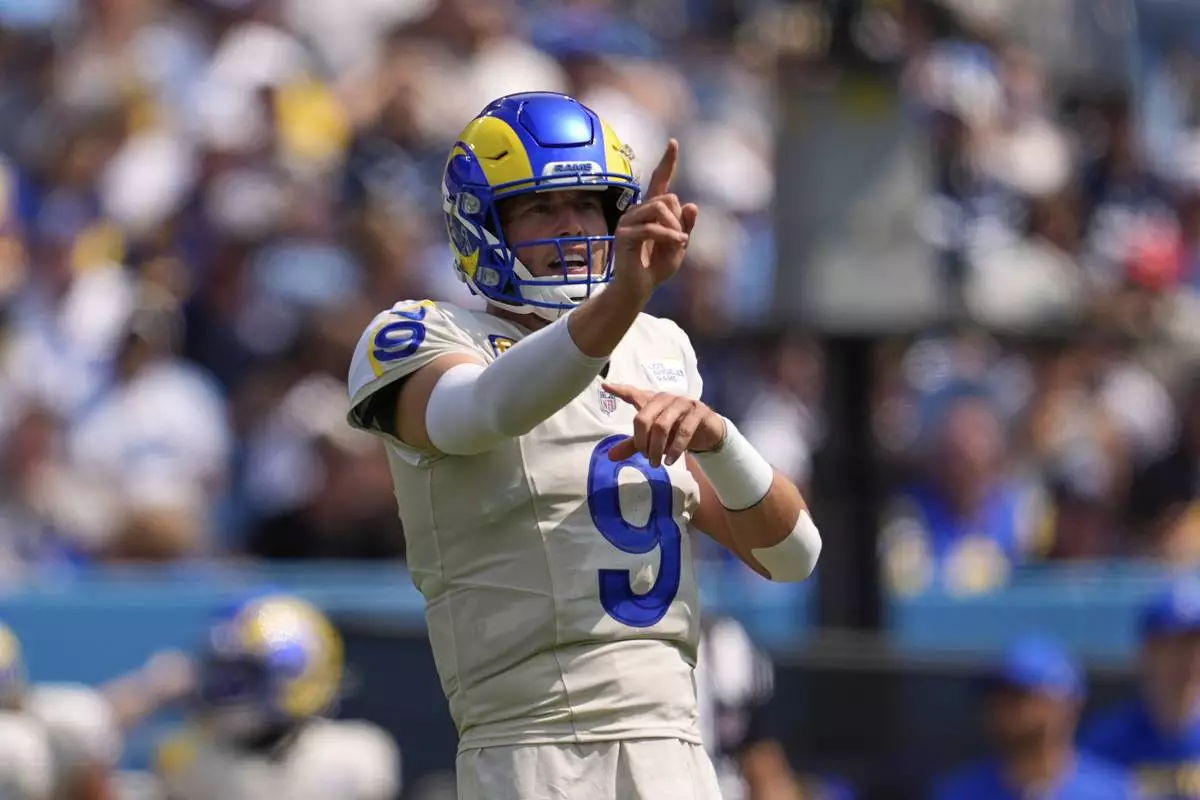 Los Angeles Rams quarterback Matthew Stafford gestures during the first half of an NFL football game against the Tennessee Titans, Sunday, Sept. 14, 2025, in Nashville, Tenn. (AP Photo/George Walker IV)