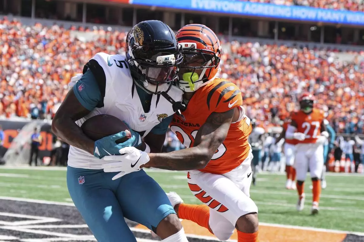 Jacksonville Jaguars wide receiver Dyami Brown (5) catches a touchdown past Cincinnati Bengals cornerback DJ Turner II during the first half of an NFL football game, Sunday, Sept. 14, 2025, in Cincinnati. (AP Photo/Jeff Dean)