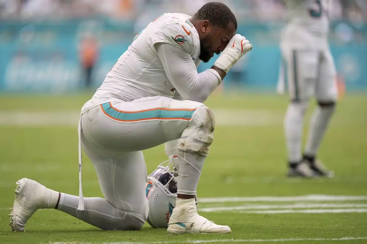 Miami Dolphins' Bradley Chubb reacts after teammate Chop Robinson is hurt during the second half of an NFL football game against the New England Patriots Sunday, Sept. 14, 2025, in Miami Gardens, Fla. (AP Photo/Rebecca Blackwell)
