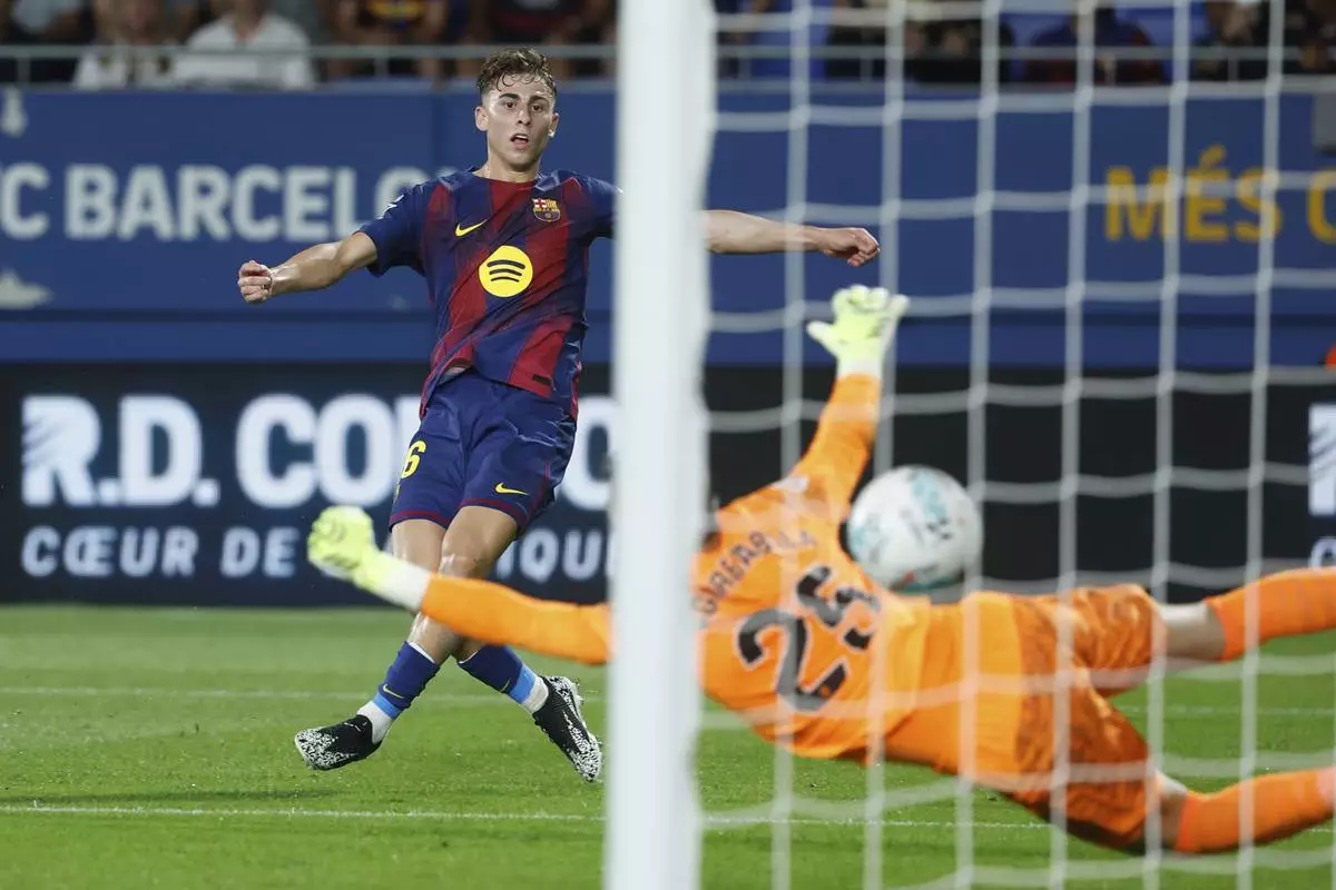 Barcelona's Fermin Lopez scores his side's opening goal during a Spanish La Liga soccer match between FC Barcelona and Valencia at the Johan Cruyff stadium in Barcelona, Spain, Sunday, Sept. 14, 2025. (AP Photo/Joan Monfort)