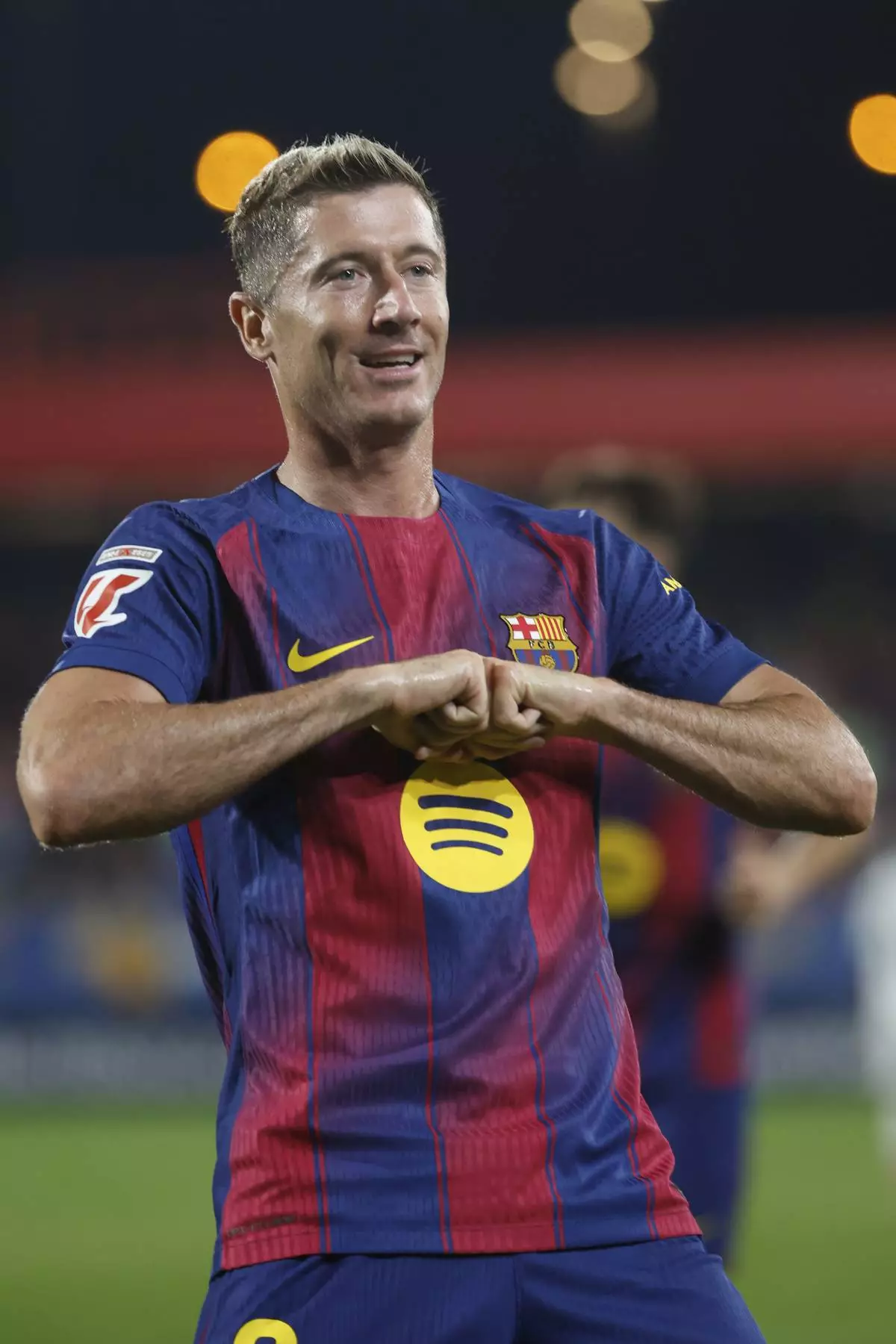 Barcelona's Robert Lewandowski celebrates scoring his side's 5th goal during a Spanish La Liga soccer match between FC Barcelona and Valencia at the Johan Cruyff stadium in Barcelona, Spain, Sunday, Sept. 14, 2025. (AP Photo/Joan Monfort)