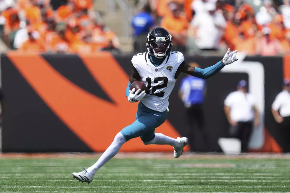 Jacksonville Jaguars wide receiver Travis Hunter (12) runs after a catch first half of an NFL football game against the Cincinnati Bengals, Sunday, Sept. 14, 2025, in Cincinnati. (AP Photo/Jeff Dean)