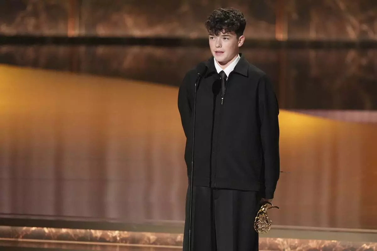 Owen Cooper accepts the award for outstanding supporting actor in a limited or anthology series or movie for "Adolescence" during the 77th Primetime Emmy Awards on Sunday, Sept. 14, 2025, at the Peacock Theater in Los Angeles. (AP Photo/Chris Pizzello)
