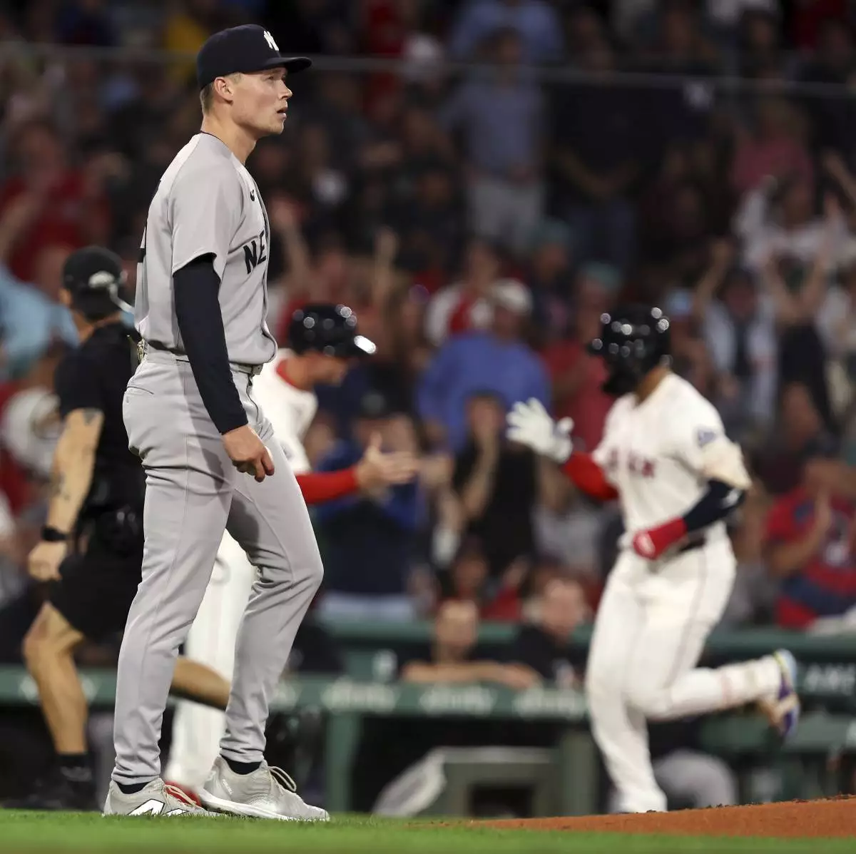 Boston Red Sox's Carlos Narvaez, back right, rounds third base after hitting a solo home run in the bottom of the first inning off New York Yankees tarting pitcher Will Warren, front left, in the first inning of a baseball game Sunday, Sept. 14, 2025, in Boston. (AP Photo/Jim Davis)