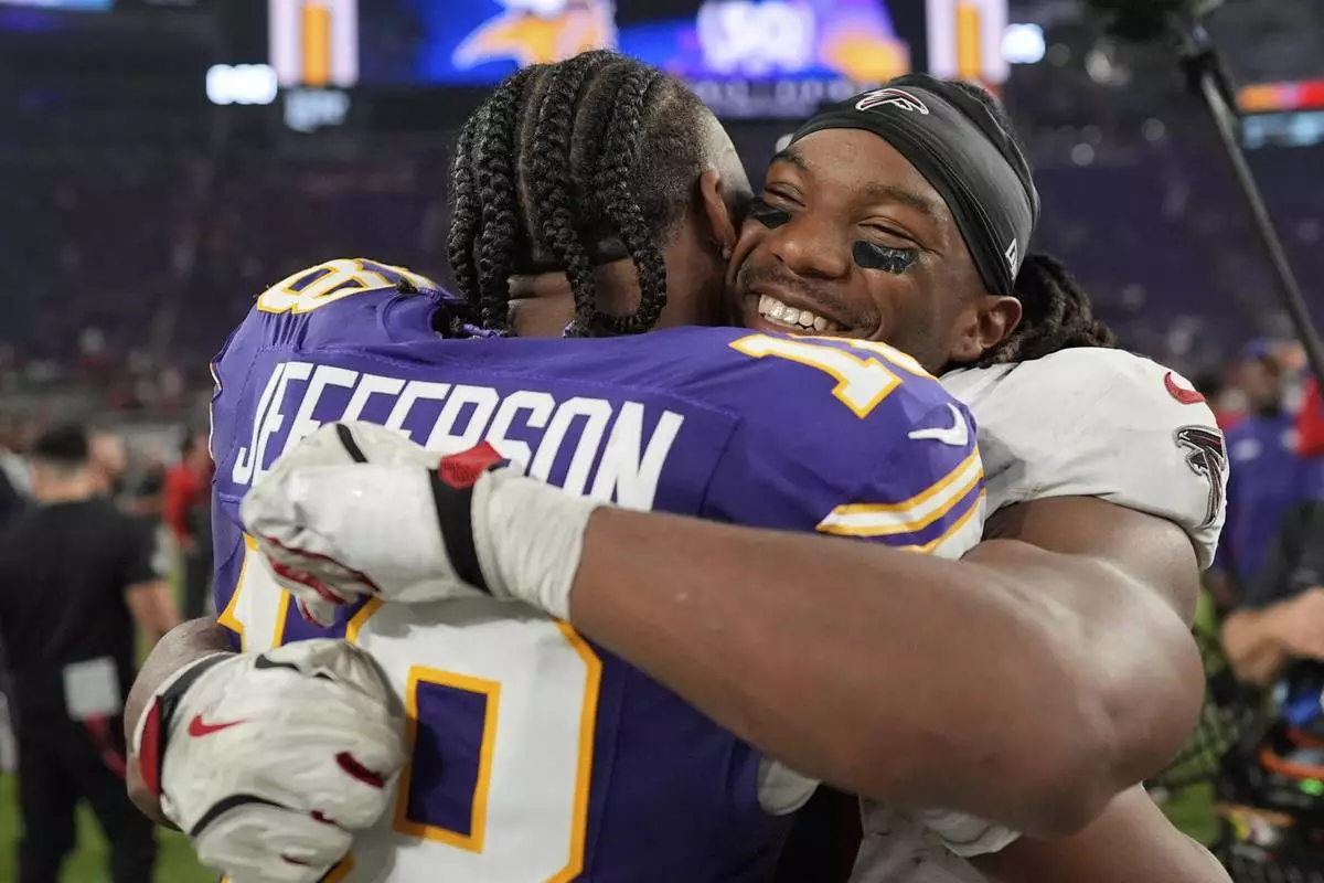 Atlanta Falcons running back Bijan Robinson (7) and Minnesota Vikings wide receiver Justin Jefferson (18) meet after an NFL football game, Sunday, Sept. 14, 2025, in Minneapolis. (AP Photo/Mike Stewart)