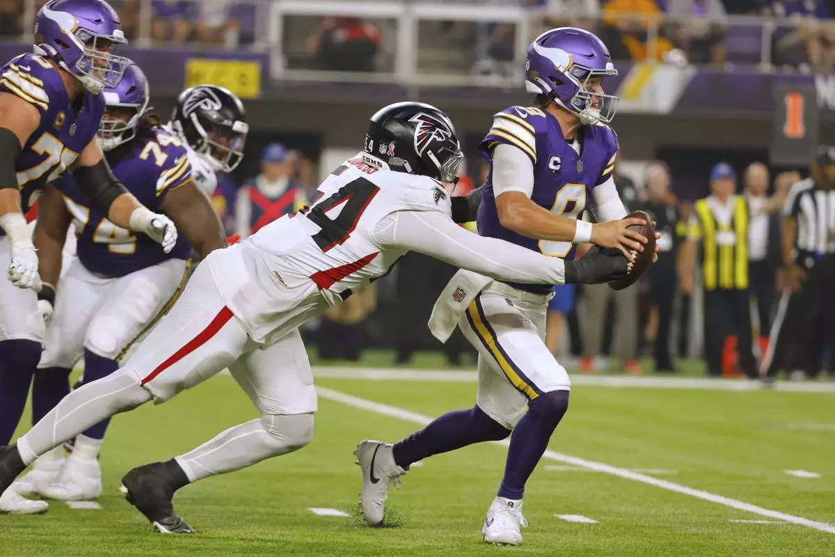 Atlanta Falcons defensive tackle Brandon Dorlus (54) sacks Minnesota Vikings quarterback J.J. McCarthy (9) during the first half of an NFL football game, Sunday, Sept. 14, 2025, in Minneapolis. (AP Photo/Bruce Kluckhohn)