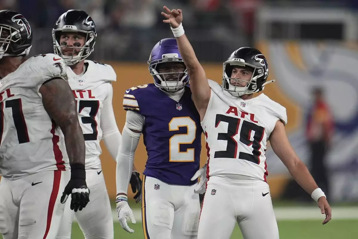 Atlanta Falcons place-kicker Parker Romo (39) celebrates a field goal during the second half of an NFL football game against the Minnesota Vikings, Sunday, Sept. 14, 2025, in Minneapolis. (AP Photo/Mike Stewart)