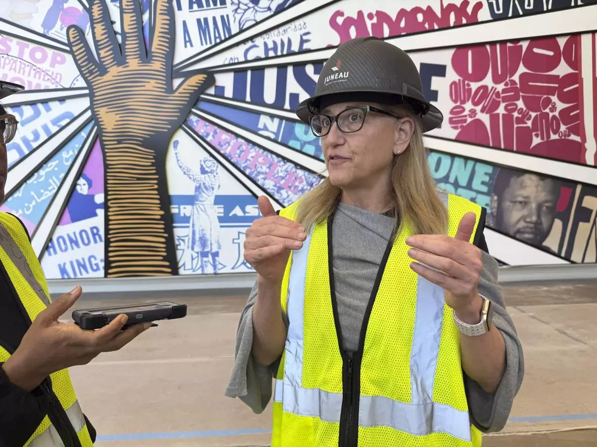 Jill Savitt, President and CEO of the National Center for Civil and Human Rights in Atlanta, leads a hard-hat tour of the expanded museum before its November reopening on Wednesday, Sept. 10, 2025. (AP Photo/Michael Warren)