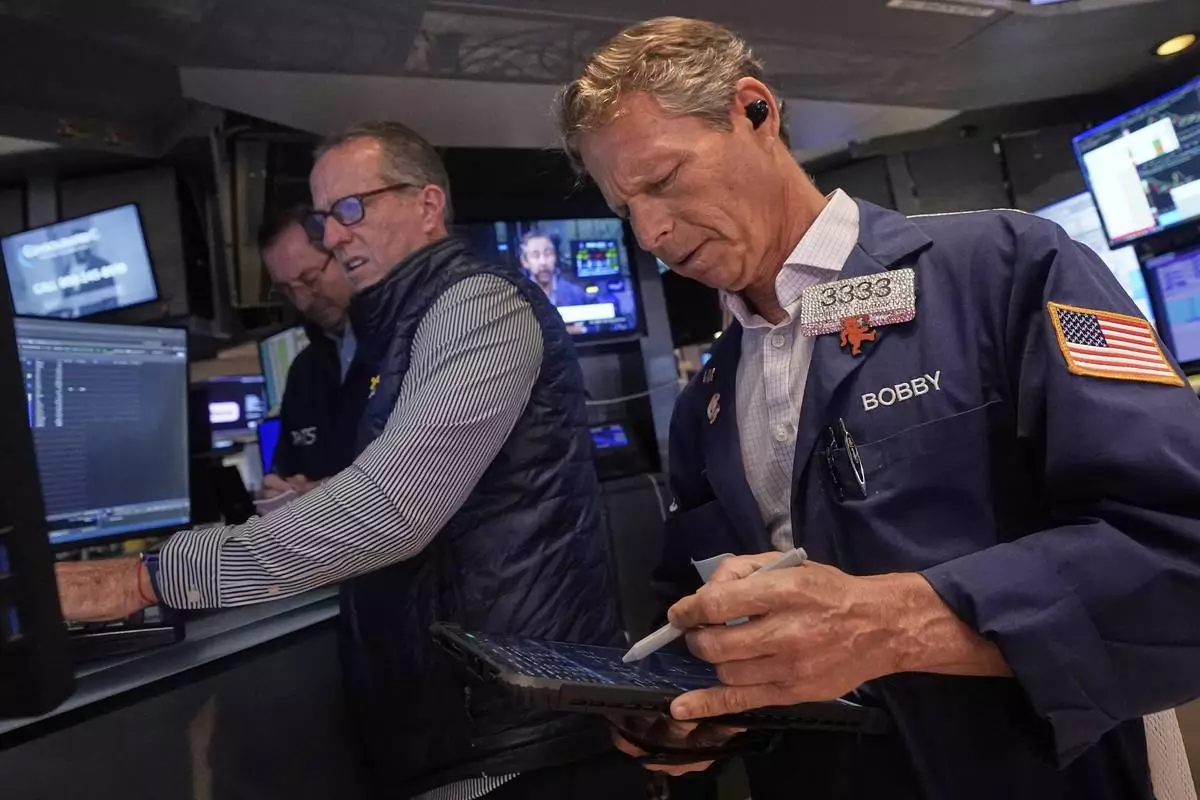 Trader Robert Charmak, right, and specialist Glenn Carell, center, work on the floor of the New York Stock Exchange, Wednesday, Sept. 10, 2025. (AP Photo/Richard Drew)