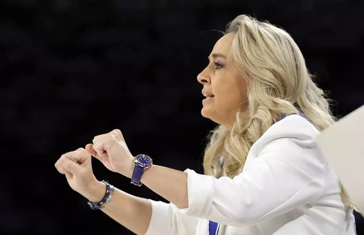 Las Vegas Aces head coach Becky Hammon calls out to players during the first half of Game 1 against the Seattle Storm in the first round of the WNBA basketball playoffs Sunday, Sept. 14, 2025, in Las Vegas. (AP Photo/Steve Marcus)