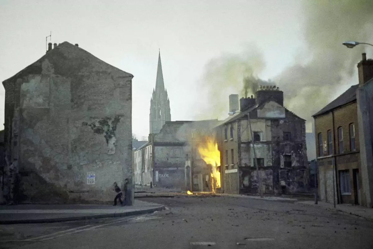 FILE - A building burns in the bogside district of Londonderry, Northern Ireland, in the aftermath of Bloody Sunday, in February 1972. (AP Photo/Michel Laurent, File)