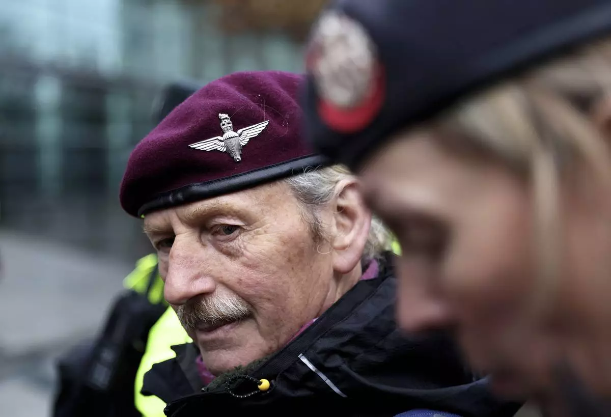 Supporters of soldier F stand outside of Belfast Crown Court, where the trial of a former paratrooper accused of the murder of two men on Bloody Sunday is taking place, in Belfast, Northern Ireland, Monday, Sept. 15, 2025. (AP Photo/Peter Morrison)