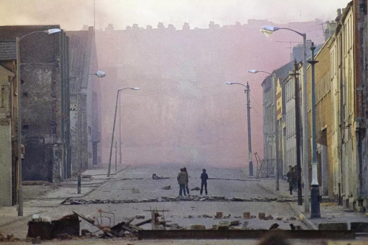 FILE - Haze from smoke bombs released by British troops in the bogside district of Londonderry, Northern Ireland, on Feb. 1, 1972. (AP Photo/Michel Laurent, File)