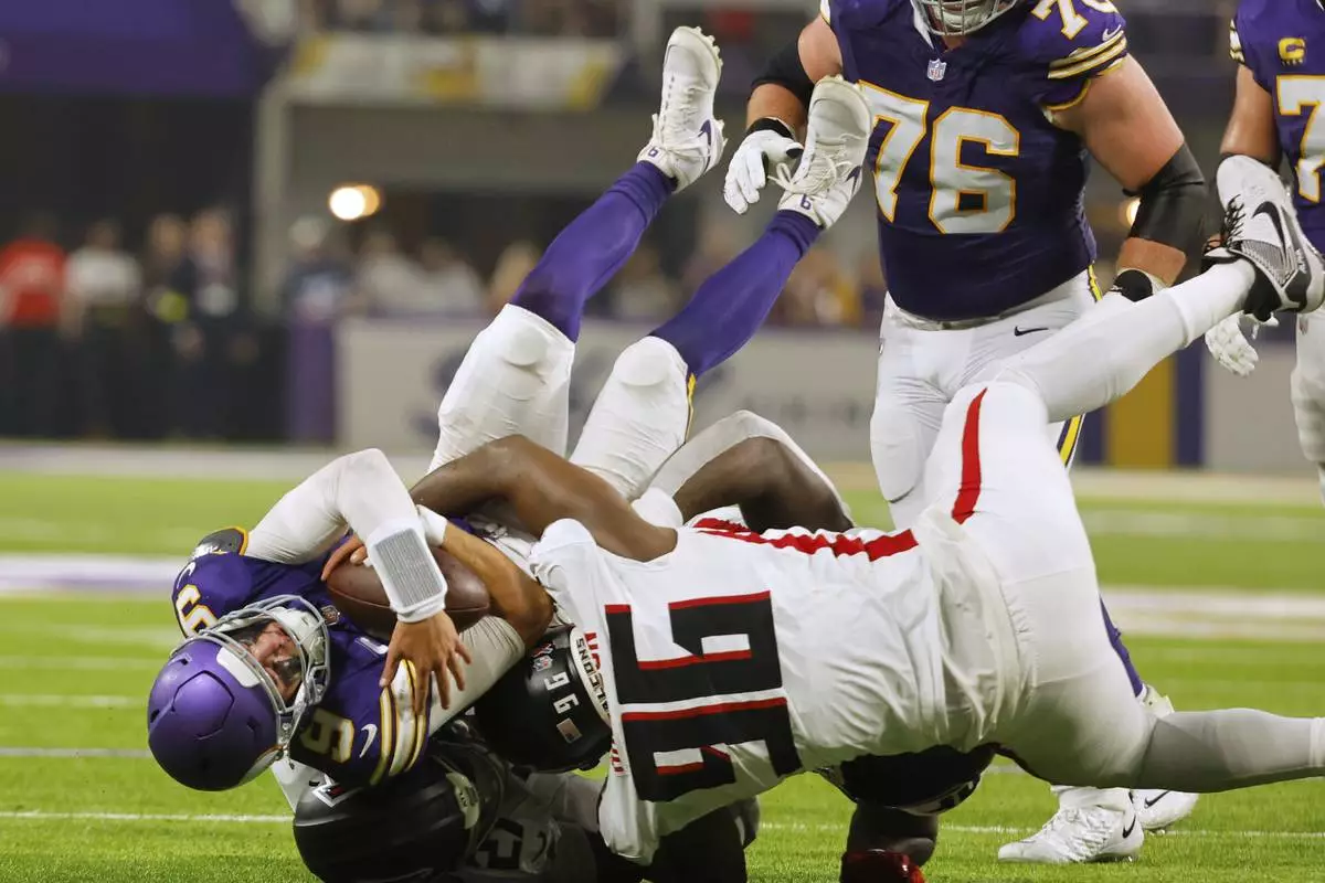 Atlanta Falcons defensive tackle Brandon Dorlus (54) sacks Minnesota Vikings quarterback J.J. McCarthy (9) during the first half of an NFL football game, Sunday, Sept. 14, 2025, in Minneapolis. (AP Photo/Bruce Kluckhohn)