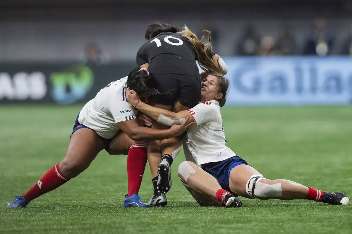 FILE - New Zealand's Atlanta Lolohea, center, is stopped by France's Ambre Mwayembe, left, and Axelle Berthoumieu, right, during the WXV women's rugby union tournament, in Vancouver, on Oct. 12, 2024. (Ethan Cairns/The Canadian Press via AP, File)