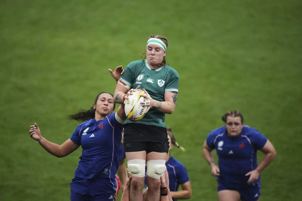 Ireland's Ruth Campbell, top, wins a line out against France's captain Mane Feleu during a Women's Rugby World Cup 2025 quarterfinal match between France and Ireland, in Exeter, England, Sunday, Sept. 14, 2025. (AP Photo/Alastair Grant)