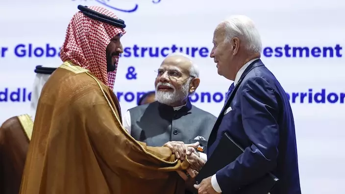 The handshake that meant nothing: Biden, Modi, and Saudi Crown Prince Mohammed bin Salman in 2023.