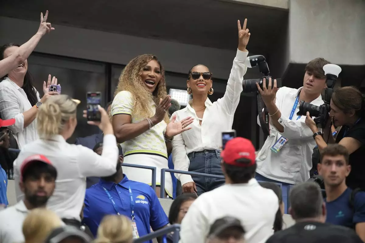 FILE - Serena Williams and Alicia Keys are seen after a match between Grigor Dimitrov, of Bulgaria, and Andrey Rublev, of Russia, during the fourth round of the U.S. Open tennis championships, Sept. 1, in New York. 2024. (AP Photo/Pamela Smith, file)