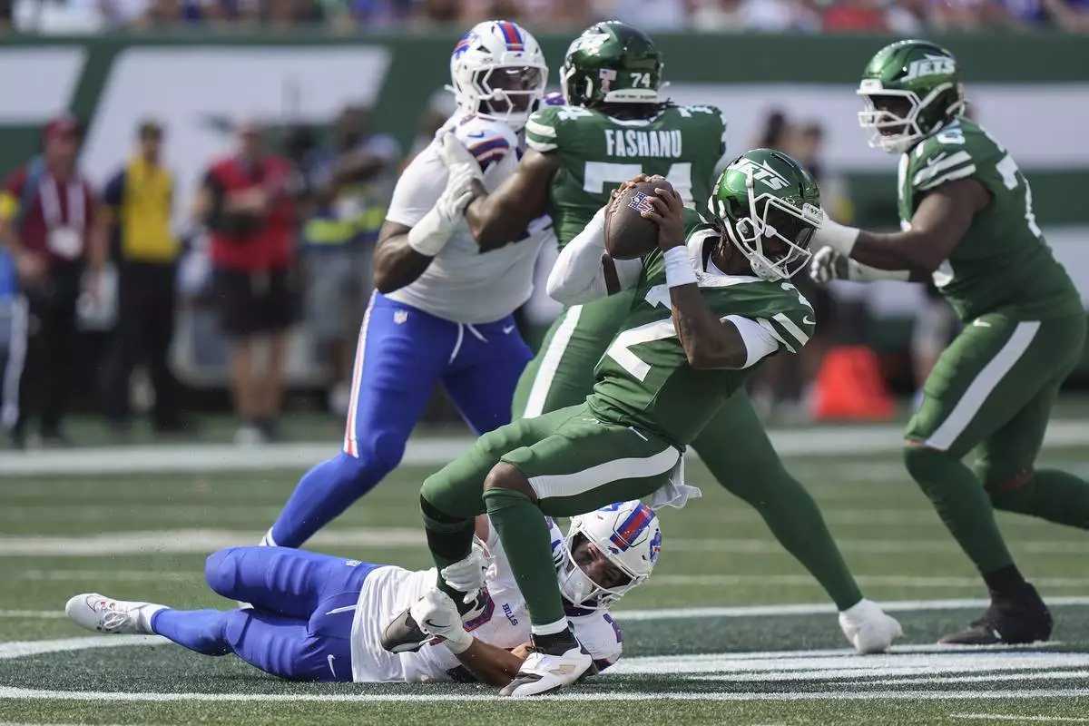 New York Jets quarterback Tyrod Taylor (2) is sacked by Buffalo Bills safety Cole Bishop (24) during the fourth quarter of an NFL football game, Sunday, Sept. 14, 2025, in East Rutherford, N.J. (AP Photo/Frank Franklin)