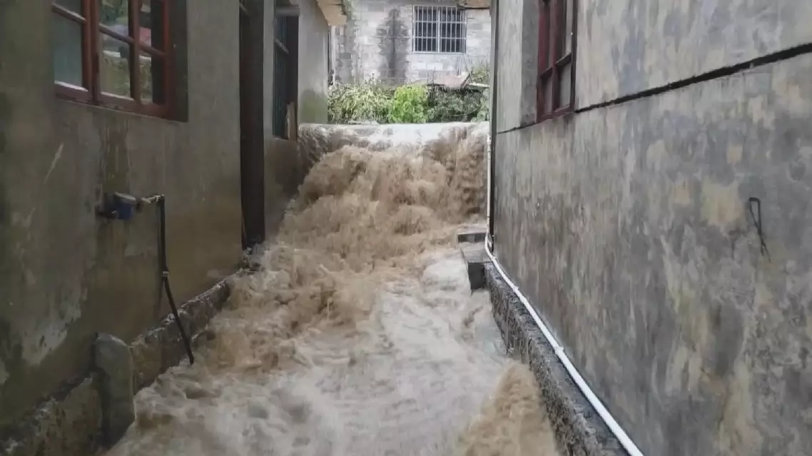 The downpour has caused severe waterlogging in low-lying areas. In Eling Neighborhood, Yinjiang County, the first floors of some residential houses were flooded, trapping residents inside.