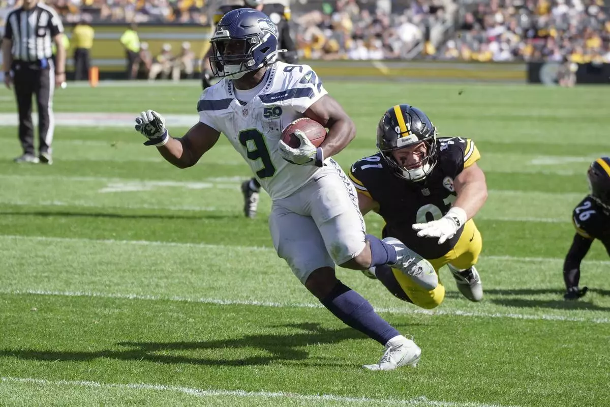 Seattle Seahawks running back Kenneth Walker III (9) gets past Pittsburgh Steelers defensive tackle Logan Lee (91) on a touchdown run during the second half of an NFL football game Sunday, Sept. 14, 2025, in Pittsburgh. (AP Photo/Gene J Puskar)