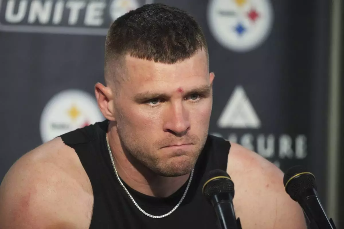Pittsburgh Steelers linebacker T.J. Watt speaks during a news conference after an NFL football game against the Seattle Seahawks, Sunday, Sept. 14, 2025, in Pittsburgh. (AP Photo/Gene J Puskar)