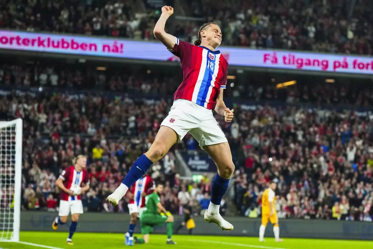Norway's Thelo Aasgaard celebrates after scoring the seventh goal during the World Cup qualifying soccer match between Norway and Moldova at Ullevaal Stadion, Oslo, Tuesday Sept. 9, 2025. (Cornelius Poppe/NTB via AP)